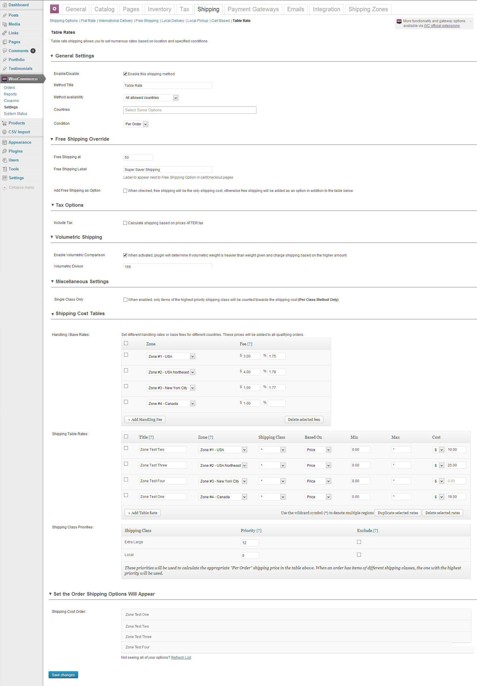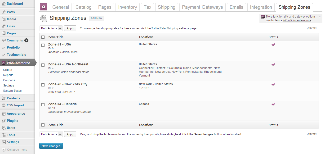 It's important to note that with the addition of zones you are now in control of their priority. This means you must change the order how you wish for rates to be overwritten. Generally this means beginning with 'Everywhere', the lowest priority, and ending with a specific set of post codes, highest priority. This plugin begins with zones top to bottom, comparing their values for the best match. By ordering it this way, a shipping zone will be assigned to 'Everywhere' first, and then look to see if there is a specific country set that the customer is shipping to. If there is, this rate will override the previous one, if not, the user will keep 'Everywhere' as their shipping zone.