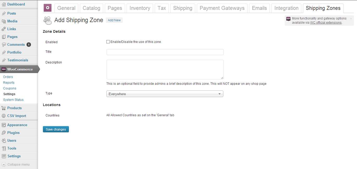 Type - There are three type of zones: Everywhere, Countries, and Postal Code. See next option for further explanation. 'Countries' 'Postal Code'